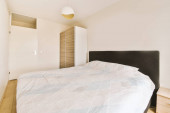Zdjęcie "Home wystrój wnętrz sypialni z łóżkiem i drewnianą szafą umieszczone w rogu w pobliżu okna w nowoczesnym apartamencie" może być wykorzystywane do celów osobistych i komercyjnych zgodnie z warunkami zakupionej licencji Royalty-free. Obraz jest dostępny do pobrania w jakości wysokiej rozdzielczości do 5760x3840.