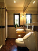 Zdjęcie "Nowoczesny dom z drewnianych łazienka" może być wykorzystywane do celów osobistych i komercyjnych zgodnie z warunkami zakupionej licencji Royalty-free. Obraz jest dostępny do pobrania w jakości wysokiej rozdzielczości do 5760x3840.