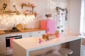 Jesienne wnętrze kuchni. Czerwone i żółte liście i kwiaty w wazonie i dynia na białym tle.
