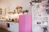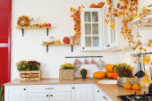 Zdjęcie "Jesienne wnętrze kuchni. Czerwone i żółte liście i kwiaty w wazonie i dynia na białym tle." może być wykorzystywane do celów osobistych i komercyjnych zgodnie z warunkami zakupionej licencji Royalty-free. Obraz jest dostępny do pobrania w jakości wysokiej rozdzielczości do 5760x3840.