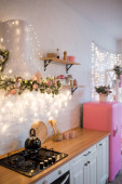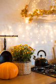 Zdjęcie "Jesienne wnętrze kuchni. Czerwone i żółte liście i kwiaty w wazonie i dynia na białym tle." może być wykorzystywane do celów osobistych i komercyjnych zgodnie z warunkami zakupionej licencji Royalty-free. Obraz jest dostępny do pobrania w jakości wysokiej rozdzielczości do 5760x3840.