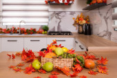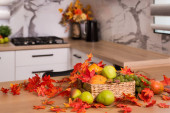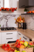 Jesienne wnętrze kuchni. Czerwone i żółte liście i kwiaty w wazonie i dynia na białym tle.