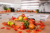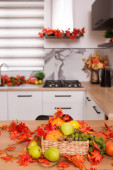 Jesienne wnętrze kuchni. Czerwone i żółte liście i kwiaty w wazonie i dynia na białym tle.