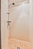 Kran prysznicowy przymocowany do ściany płytkowej w pobliżu przegrody szklanej i ozdobnego krawężnika w umywalni w domu