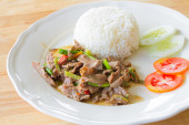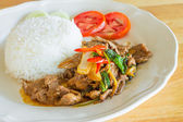 Stir-fried pork with garlic and pepper, and sliced cucumber served with jasmine rice, a white dish, a popular Thai dish