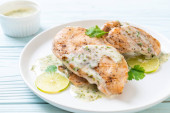 grillowany kurczak z masłem, cytryną i czosnkiem na białym talerzu