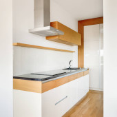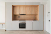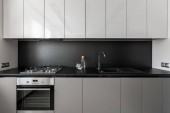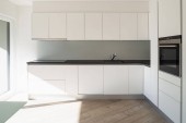 Simple and minimalist kitchen interior with dark tiled floor, white cupboards and drawers and wooden wall