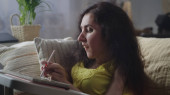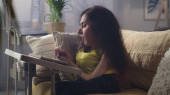 Woman with disability in a wheelchair at home browsing the internet, online shopping or use social media using a laptop at daytime in cozy room