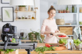Zdjęcie "Young woman cooking pasta while recording cooking video class in kitchen" może być wykorzystywane do celów osobistych i komercyjnych zgodnie z warunkami zakupionej licencji Royalty-free. Obraz jest dostępny do pobrania w jakości wysokiej rozdzielczości do 5760x3840.