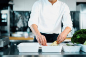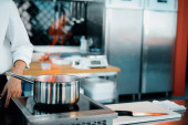 Restaurant professional kitchen: chef prepares delicious dish, beats eggs in a bowl