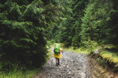 Photo from the back of a female tourist walking along a forest path in the mountains during a hike.
