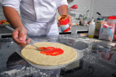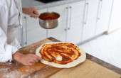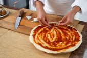 Cropped view of a housewife in beige chefs apron spreading freshly made tomato sauce on rolled out dough in pizza pan. Fresh organic ingredients on a kitchen table. Cooking. Culinary. Italian cuisine