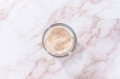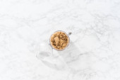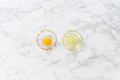 Flat lay. Measured ingredients in glass mixing bowls to bake banana oatmeal muffins.