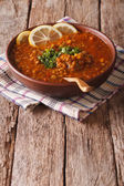 Zupa z czerwonej soczewicy z cytryny i świeżych ziół, pionowych. widok z góry