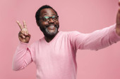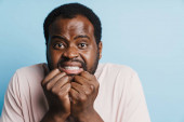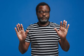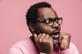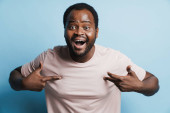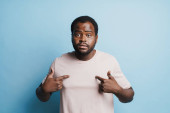 Black bearded man in eyeglasses expressing surprise at camera isolated over blue background