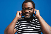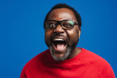 Zdjęcie "Black bearded man in eyeglasses expressing surprise at camera isolated over blue background" może być wykorzystywane do celów osobistych i komercyjnych zgodnie z warunkami zakupionej licencji Royalty-free. Obraz jest dostępny do pobrania w jakości wysokiej rozdzielczości do 5760x3840.