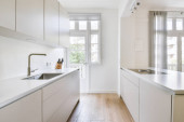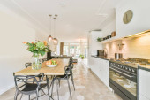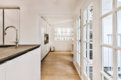 Zdjęcie "Wnętrze jasnej kuchni i jadalni z drzwiami balkonowymi we współczesnym apartamencie w dzień" może być wykorzystywane do celów osobistych i komercyjnych zgodnie z warunkami zakupionej licencji Royalty-free. Obraz jest dostępny do pobrania w jakości wysokiej rozdzielczości do 5760x3840.