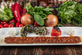 Traditional Turkish kebabs. Eggplant kebab, Adana kebab. With tomatoes, peppers, garlic, bulgur pilaf and herbs.Turkish name; patlican kebab, adana kebab.