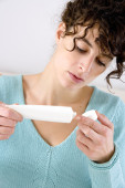zbliżenie na młoda kobieta, patrząc na test ciążowy