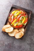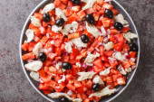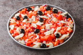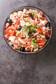 Spanish empedrat white Beans salad with cod, tomatoes, bell peppers, onions, eggs and black olives close-up in a bowl on the table. horizontal top view from abov