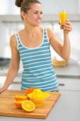 Zbliżenie na szczęśliwy młody gospodyni daje pomarańczowy