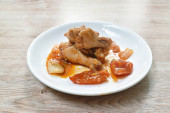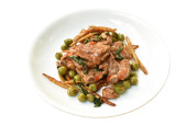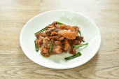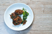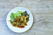 spicy deep fried slice bass fish with eggplant and pepper on plate