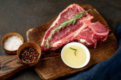 Raw ribeye steak on a wooden board. Preparing raw beef steak for barbecue grill