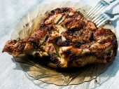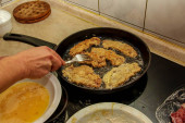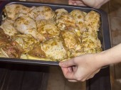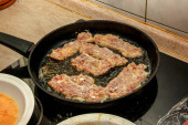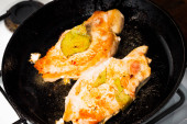 Meat with kiwi fruit. Fried chicken pieces with kiwi slices on a grill pan.