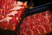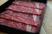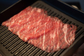 Cienko krojone surowej wołowiny na tacy przygotować do gotowania klienta. Japoński hot pot znany również jako Shabu Shabu lub Sukiyaki jest styl japoński jest popularnym lokalnym jedzeniem w krajach azjatyckich.