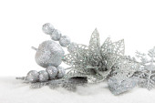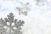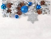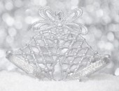 Trzy srebrne prezenty ze srebrnej wstążki na śniegu