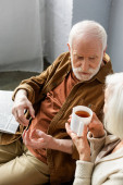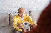 Smiling granddad looking at blurred african american grandson with cup of tea at home