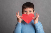 Ten year old school boy showing heart shape hands in home video schooling situation, close up looking into wide angle camera