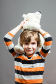 Ten year old school boy showing home grown plant of natural science project in home video schooling situation, close up looking into wide angle camera