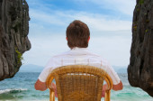 Szczęśliwy podróżnik w białej koszuli cieszyć się pięknym widokiem, sam Turysta z kapeluszem stojący i relaksujący nad oceanem. koncepcja podróży, lata i wakacji