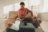 Laughing senior man holding smartphone while sitting in wheelchair at home