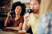 A multicultural group of friends toasting with red wine in a restaurant at the dinner table.