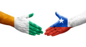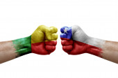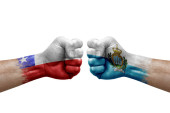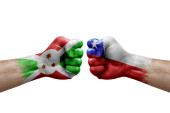 Two hands punch to each others on white background. Country flags painted fists, conflict crisis concept between bangladesh and chile