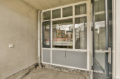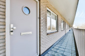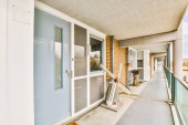 Korytarz współczesnego mieszkania z czarnymi szafami i otwartymi drzwiami prowadzącymi na taras