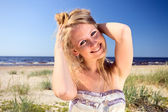 Słodka młoda dziewczyna w bardzo żółta sukienka odpoczynek na plaży