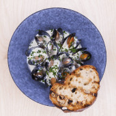 Blue mussels stewed in cream wine sauce with garlic and herbs. Italian or French traditional food
