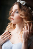 Piękna panna młoda blondynka z doskonały makijaż i włosy styl w eleganckie wnętrza