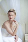 Piękna panna młoda blondynka z doskonały makijaż i włosy styl w eleganckie wnętrza