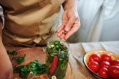 Close-up of the hands of an unrecognizable woman, housewife in a beige apron, chopping fresh culinary herbs on a wooden cutting board while preparing brine for pickling chili peppers at home kitchen