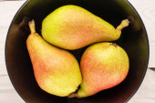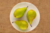 Four juicy pears with a white ceramic plate on a wooden table, close-up, top view.