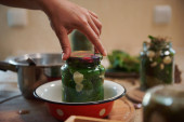 Zdjęcie "Focus on a glass jar, filled with freshly pickled cucumbers, herbs and fresh garlic cloves, on a blurred background of a woman, housewife making pickles at home kitchen. Marinating, canning, pickling." może być wykorzystywane do celów osobistych i komercyjnych zgodnie z warunkami zakupionej licencji Royalty-free. Obraz jest dostępny do pobrania w jakości wysokiej rozdzielczości do 5760x3840.