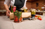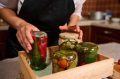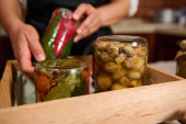 Details: Hands of a housewife turning over the glass jars of pickled cucumbers covered with pickling marinade, placing them with the lid down on wooden crate in the home kitchen. Harvest conservation.