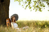 rudowłosy dziewczyna siedzi w pobliżu drzewa z rocznika kamery.