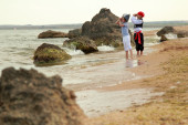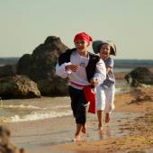 ładny małej dziewczynki i chłopca w piękne stroje, pirackie kapelusze i szuka skarbu w brzegu