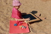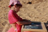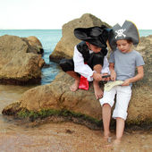 ładny małej dziewczynki i chłopca w piękne stroje, pirackie kapelusze i szuka skarbu w brzegu