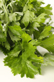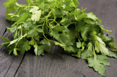 Salad, parsley and dill on a dark cutting board against a blue concrete background. Cooking a vegetarian dish with fresh greens